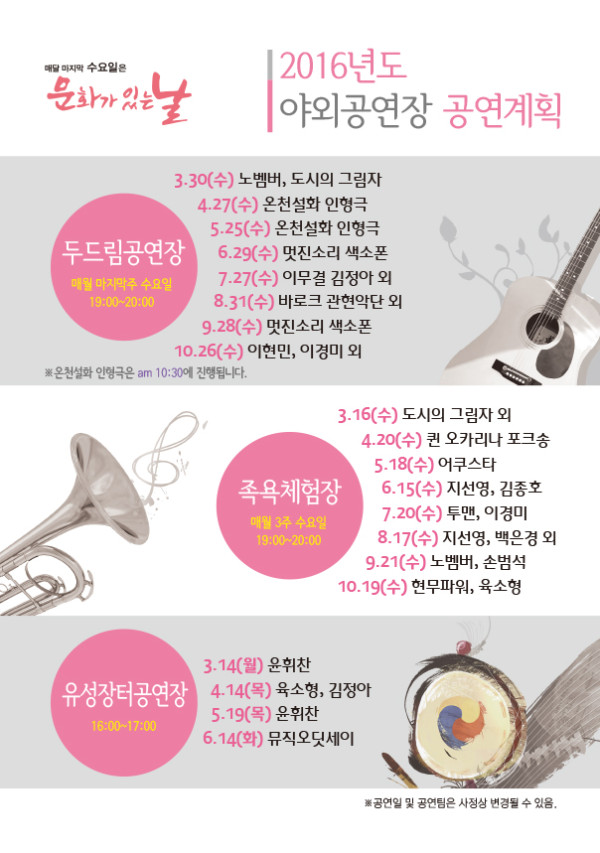 3월부터 10월까지 ^.^ 매주 마지막 수요일(문화가 있는 날) 이 외에도 많은 공연이 있으니, 참고하시기 바랍니다.