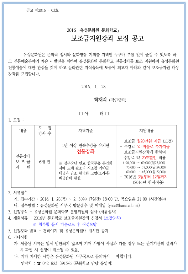 2016년 유성문화원 보조금지원강좌 모집공고 > 공지사항