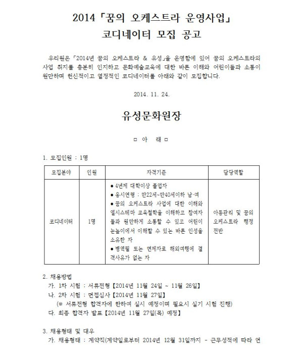 2014 꿈의 오케스트라 운영사업 코디네이터 모집 공고