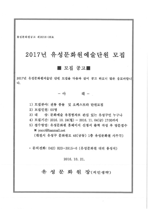 2017년 유성문화원 예술단 모집공고 > 공지사항