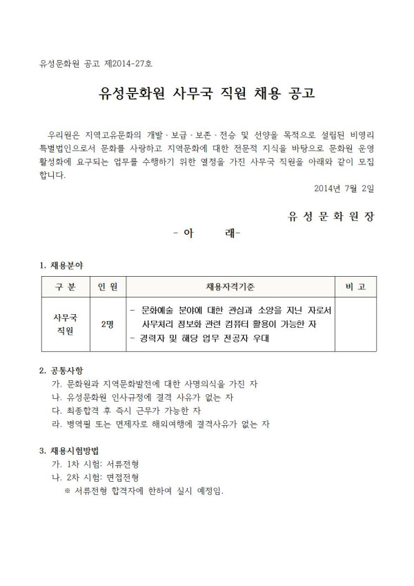유성문화원 사무국 직원 채용 공고 > 공지사항
