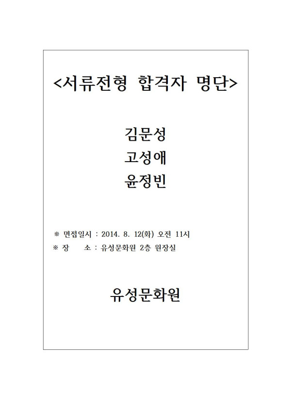 유성문화원 문화담당 서류전형 합격자 명단