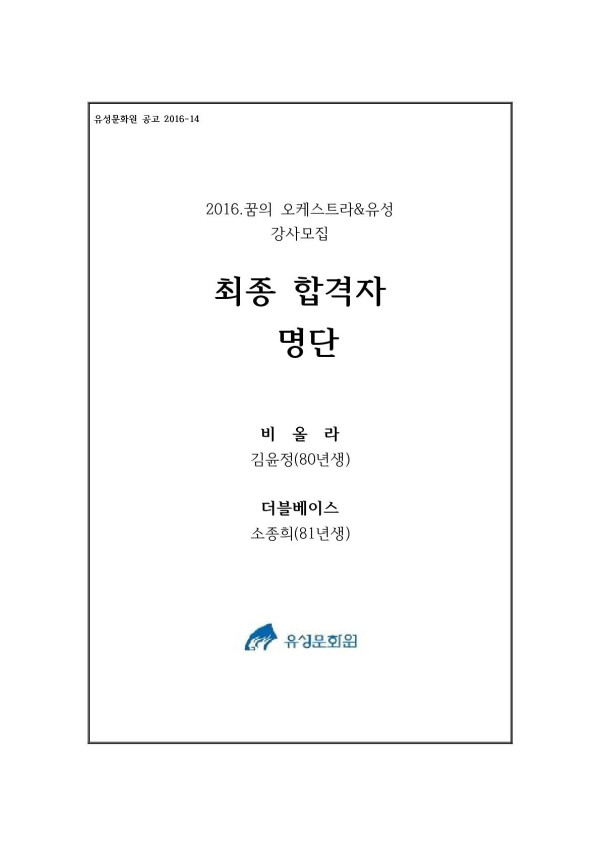 2016 '꿈의 오케스트라 & 유성' 파트별강사 재모집 최종합격자 공지 > 공지사항