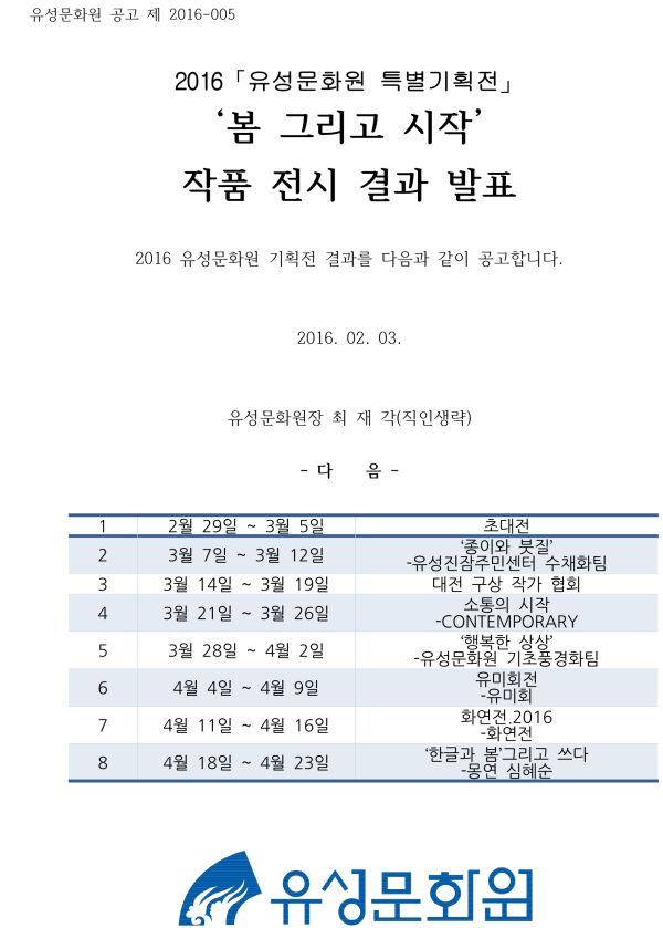 2016 유성문화원 특별기획전 '봄 그리고 시작' 작품전시 선정 발표 > 공지사항