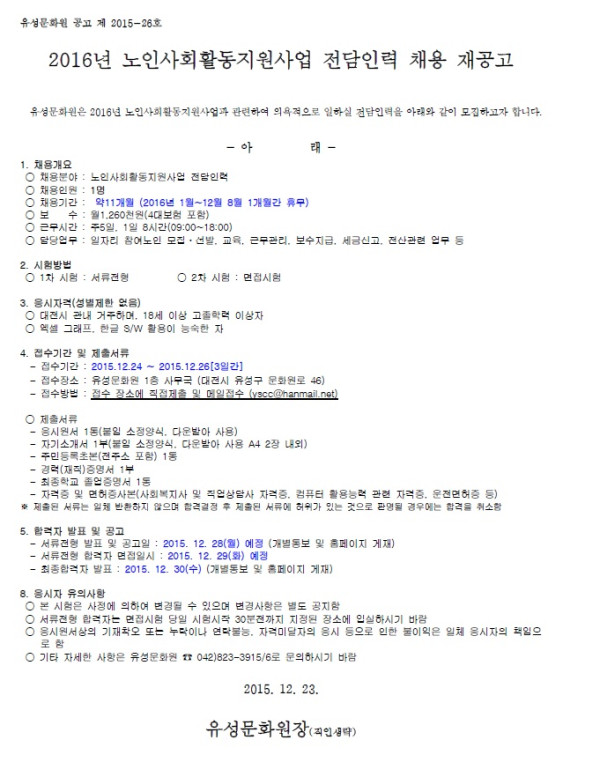2016년 노인사회활동지원사업 전담인력 채용 재공고