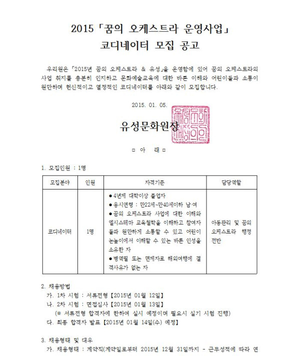 2015 꿈의 오케스트라 유성 코디네이터 모집공고 > 공지사항